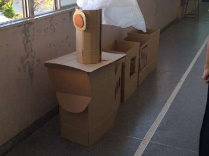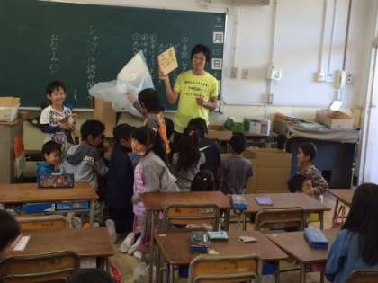 「ノマは ちいさな はつめいか」という本でした。男の子のノマが、段ボールを使って汽車を作る話でした。秋山先生も本を読みながら、段ボールで何やら作り始めました。お話が終わった後に「何か音が聞こえるよ〜。」と声をかけると「しゅ、しゅ、しゅ、しゅ」の音とともに大きな段ボールでできた汽車が教室に入ってきました。秋山先生が教室で作った最後の部品をつけて汽車が完成しました。みんなでじゃんけんをして、勝った子どもは特別に汽車に乗せてもらいました。本の内容に沿って体験化することで、一層楽しい読み聞かせになりました。