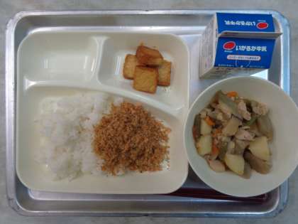 💎けいにくとじゃがいものにもの💎あつあげのしょうゆだれかけ💎べにざけそぼろ💎ごはん💎ぎゅうにゅう