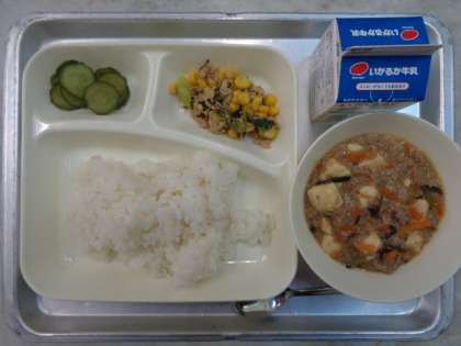 💎マーボーどうふ💎きゅうりのちゅうかあえ💎ツナとチンゲンサイのいためもの💎ごはん💎ぎゅうにゅう