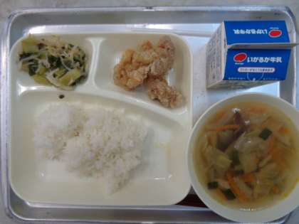 💎けいにくのからあげ💎ちゅうかスープ💎チンゲンサイともやしのあまずあえ💎ごはん💎ぎゅうにゅう