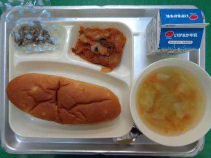 💎にこみハンバーグ💎やさいスープ💎ミニフィッシュ💎おさつパン💎ぎゅうにゅう