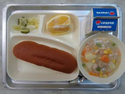 💎けいにくとコーンのシチュー💎キャベツときゅうりのサラダ💎かわちばんかん💎こくとうパン💎ぎゅうにゅう