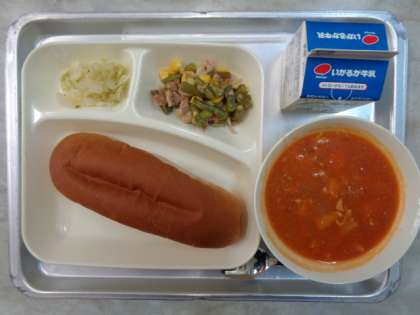 💎ケチャップに💎ベーコンとさんどまめのソテー💎キャベツのバジルふうみサラダ💎こくとうパン💎ぎゅうにゅう