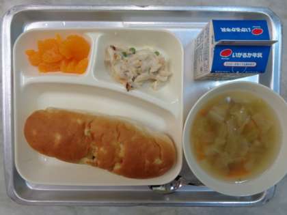 💎マカロニグラタン💎キャベツのスープ💎みかんのかんづめ💎おさつパン💎ぎゅうにゅう