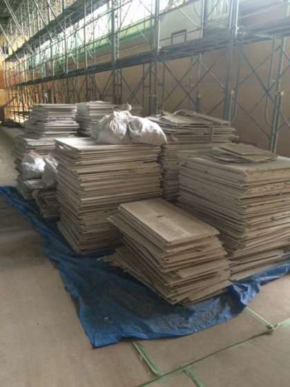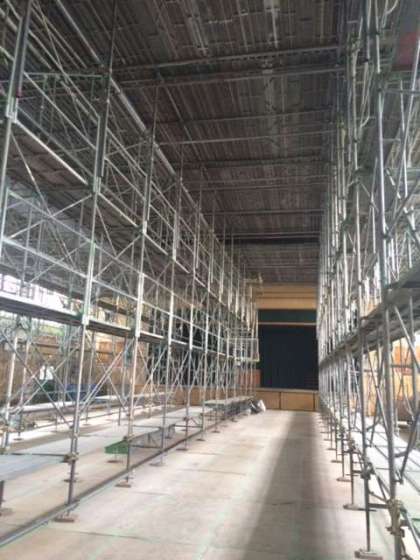 講堂の中に足場が組まれ、天井にあった石膏ボードがすべて取り外されていました。現在石膏ボードを吊り下げていた鋼材を取り外しています。外された石膏ボードの量を見ると、地震などで落ちて来ないように外しておくのがよいと改めて感じます。もう少しの期間講堂が使えませんが、みんなの安心安全のため、ご理解いただきたいと思います。