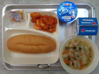 💎えびのチリソース💎ちゅうかスープ💎ヨーグルト💎コッペパン(添加物:みかんジャム)💎ぎゅうにゅう