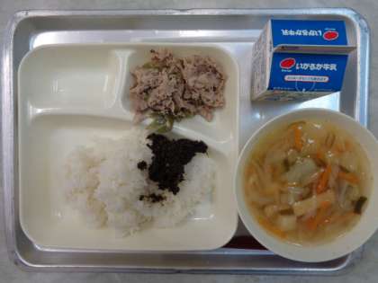 今日の給食には、さとうやしょうゆ、だし、しいたけを煮て、かつおぶしときざみのりを加えて煮つめた「のりのつくだ煮」が登場しました。