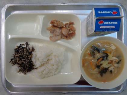 💎けいにくのてりやき💎みそしる💎さかなひじきそぼろ💎ごはん💎ぎゅうにゅう
