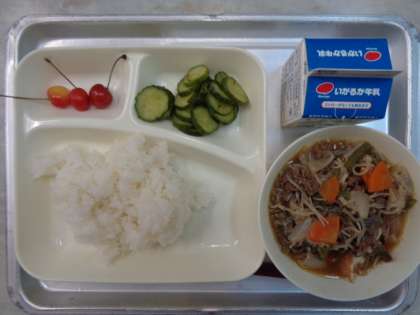 💎ぎゅうにくとやさいのいために💎きゅうりのしょうがづけ💎さくらんぼ💎ごはん💎ぎゅうにゅう
