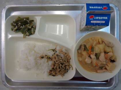 💎けいにくとやさいのみそに💎オクラのうめふうみ💎ツナっぱいため💎ごはん💎ぎゅうにゅう