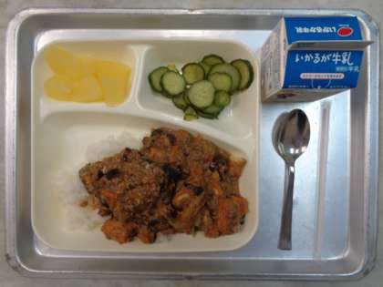 💎マーボーあつあげどんぶり💎あっさりきゅうり💎りんごのかんづめ💎ごはん💎ぎゅうにゅう