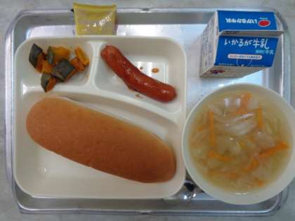 💎ウインナーのケチャップソース💎スープ💎やきカボチャ💎コッペパン(添加物:アプリコットジャム)💎ぎゅうにゅう