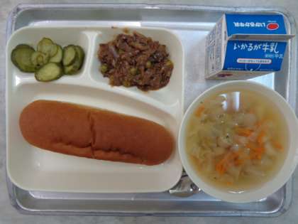 💎ぎゅうにくのソースに💎スープ💎きゅうりピクルス💎こくとうパン💎ぎゅうにゅう
