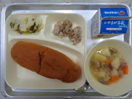 💎けいにくのバジルやき💎ベーコンとやさいのスープに💎キャベツときゅうりのサラダ💎こくとうパン💎ぎゅうにゅう