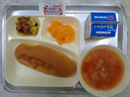 💎カレーマカロニグラタン💎トマトスープ💎みかんのかんづめ💎コッペパン(添加物:いちごジャム)💎ぎゅうにゅう