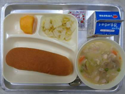 💎けいにくとさつまいものシチュー💎はくさいのピクルス💎かき(ひらたねなしがき)💎コッペパン(添加物:いちごジャム)💎ぎゅうにゅう