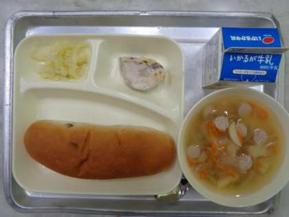 💎かつおのガーリックマリネやき💎ウインナーとじゃがいものスープ💎キャベツのサラダ💎レーズンパン💎ぎゅうにゅう