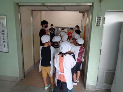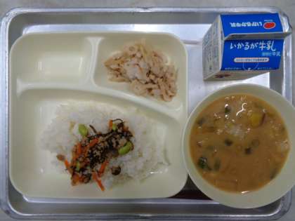 (今日の給食のジューシーは、豚ひき肉、にんじん、むきえだまめ、もずく、切りこんぶなどを使った、たきこみご飯風でした。ご飯と具を混ぜて食べました。)