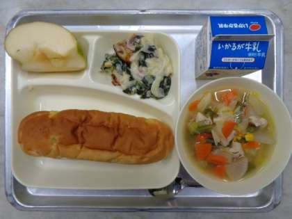💎ほうれんそうのグラタン💎スープに💎りんご💎おさつパン💎ぎゅうにゅう