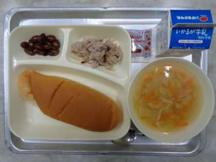 💎ぶたにくのバジルやき💎スープ💎うずらまめのグラッセ💎コッペパン(添加物:いちごジャム)💎ぎゅうにゅう