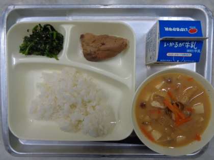 💎なまりぶしのしょうがに💎なめこのみそしる💎ほうれんそうのごまあえ💎ごはん💎ぎゅうにゅう