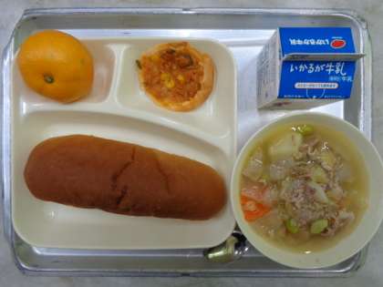💎ぶたにくとやさいのスープに💎かわりピザ💎みかん💎こくとうパン💎ぎゅうにゅう