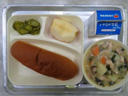 💎けいにくときのこのシチュー💎きゅうりのピクルス💎りんご💎こくとうパン💎ぎゅうにゅう