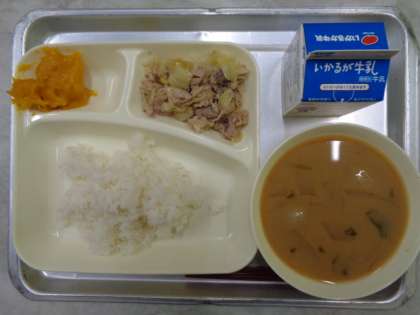 💎ぶたにくとやさいのいためもの💎いわしのつみれじる💎かぼちゃういろう💎ごはん💎ぎゅうにゅう