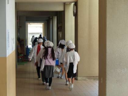 今日の給食は、いわしだんごとだいこん、ごぼう、にんじん、みつばなどが入った汁物でした。いわしだんごには、骨や歯をじょうぶにするカルシウムがふくまれています。