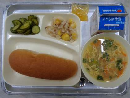 💎ちゅうかおこわ💎たまごスープ💎きゅうりのピリからあえ💎コッペパン(添加物:マーマレード)💎ぎゅうにゅう