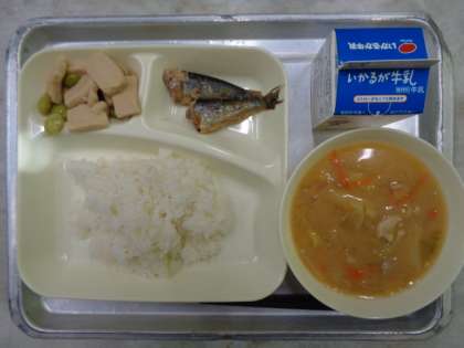 💎いわしのしょうがに💎みそしる💎こうやどうふのにもの💎ごはん💎ぎゅうにゅう