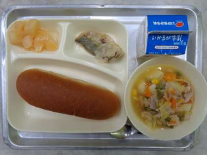 💎あじのレモンマリネ💎てぼまめのスープに💎はくとうのかんづめ💎こくとうパン💎ぎゅうにゅう