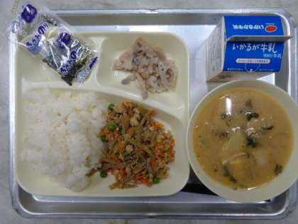 💎とりごぼうごはん[きざみのり]💎みそしる💎やきれんこん💎ぎゅうにゅう