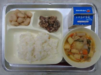 💎くじらのたつたあげ💎ぶたにくとじゃがいものにもの💎しろはなまめのにもの💎ごはん💎ぎゅうにゅう