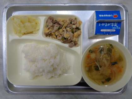 💎ぶたにくとほしずいきのみそに💎ごもくじる💎やきじゃが💎ごはん💎ぎゅうにゅう