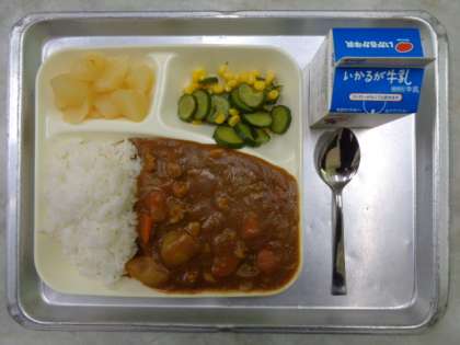 💎チキンレバーカレーライス💎きゅうりとコーンのサラダ💎ようなしのかんづめ💎ぎゅうにゅう