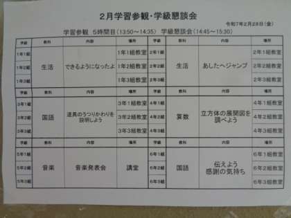 学習参観・懇談会(2月28日) 公開日 2025/02/28 更新日 2025/02/28 お知らせ 本年度最後の学習参観・懇談会でした。多数の皆さまにご来校いただき、ありがとうございました。 いいね(0)