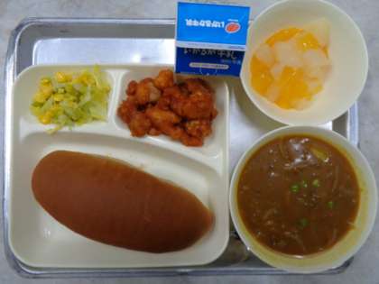 💎あげどりのバーベキューソース💎カレースープ💎キャベツとコーンのサラダ💎フルーツゼリー💎こくとうパン💎ぎゅうにゅう