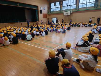 (本来は、運動場に避難しますが、雨のため講堂に避難しました。)