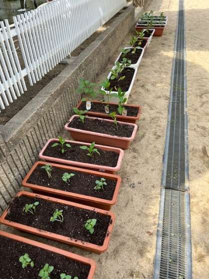 花も植える予定です。ベゴニア、マリーゴールド、ペチュニア、サルビアを植えます。すでにきれいに咲いています。1年生の教室前の花壇に植えますので、ぜひ見てください。