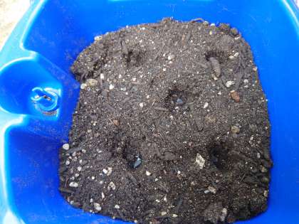 穴に1つぶずつ種を入れました。その後、まわりに肥料を置き、完成です。