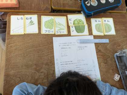 その後、自分の取ったカードを緑黄色野菜と淡色野菜に分けてから、野菜の栄養素と働きについて学びました。