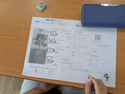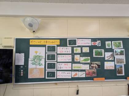 3年生では理科の教科の単元「植物の育ちとつくり」と関連した食育指導をしました。毎日何気なく食べている野菜も、花、葉、茎、根、実のどこを食べているのかを考えました。