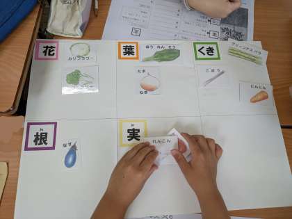 グループで野菜カードをそれぞれの部分に分けてから、正解を確認していきました。玉ねぎが葉の部分を食べていると知り子どもたちは驚いていました。野菜も成長する途中で皆さんは一番美味しい時をいただいている、命の恵みに感謝して食べることも学習をつうじて伝えました。