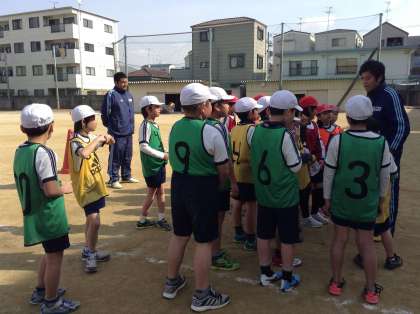 2月5日(金)に大阪府サッカー協会の方に来ていただいて、1〜3年生はサッカーの指導を受けました。ボールのけり方や止め方、パスのまわし方など本格的に教えてもらいました。みんな一生懸命走って、汗だくでした。