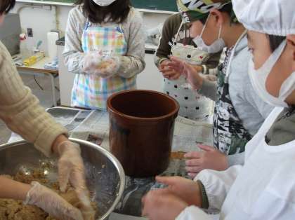 2月16日(火)に、5年生は安立はぐくみネットの方々とともに味噌づくりを行いました。前週の12日(金)に大豆を洗って水につける作業をしました。15日(月)には、その大豆を焦がさないようにゆっくり煮て準備しました。最後の仕上げとして、麹(こうじ)とやわらかくなった大豆をまぜ併せて、空気を抜き均一に発酵するようにゆっくりつぶす作業をしました。作業が終わってから「大豆から味噌ができるまで手間がかかるということがよくわかりました。」といった感想を言う児童もいました。1年後に味噌ができあがります。家庭科の調理実習でみそ汁を作って食べることになります。今から1年後の調理実習が楽しみですね。