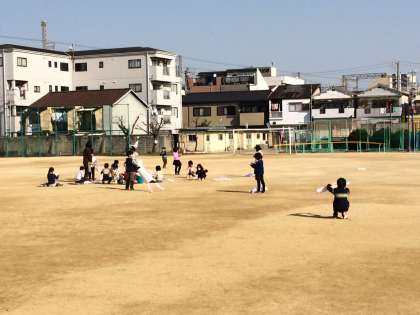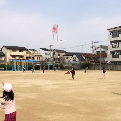 2月26日(金)、1年生は生活科で作った「ぐにゃぐにゃだこ」を飛ばして遊びました。風をうまくとらえて、空高く飛ばすことができました。