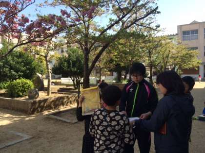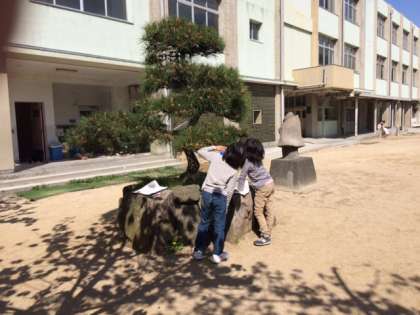 4月14日(木)、4年生は安立小の校庭で春の生き物を探し、観察しました。八重桜やチューリップ、昆虫など細かく観察していました。
