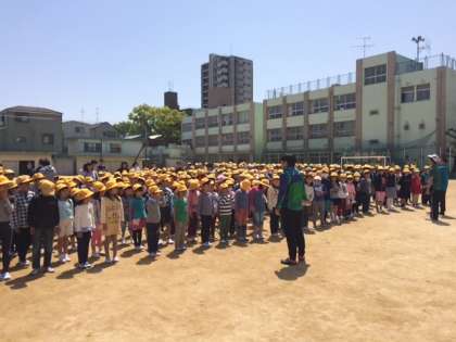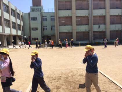4月15日(金)、学校東側のところから火事が起こったことを想定した避難訓練を行いました。自分の命を守るために、どのような行動をとるべきか考えて避難しました。ほとんどの人が、あわてず煙を吸わないように口をハンカチで抑えて運動場に集まりました。