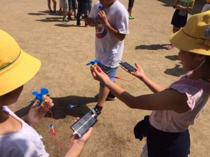 6月10日(金)、天気がよかったので、4年2組は、理科の授業で光電池の実験をしました。